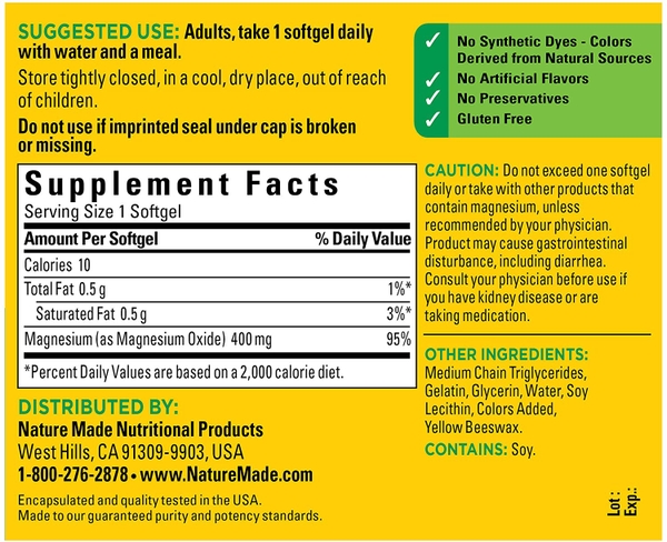 - Magnesium (as magnesium Oxide): 400mg